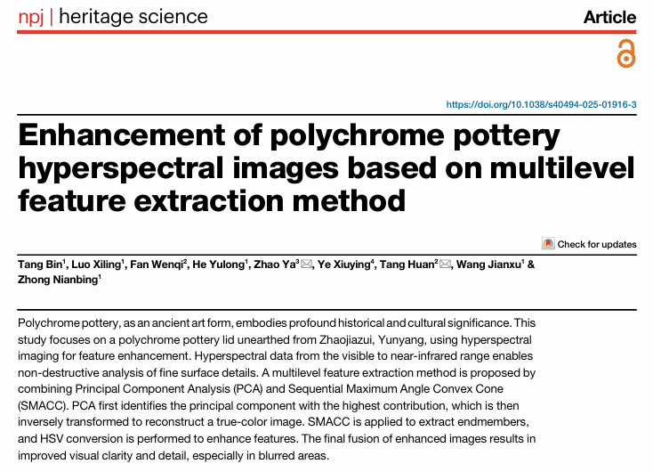 近日,Nature 系列期刊 npj Heritage Science發(fā)表了重慶理工大學(xué)湯斌教授團(tuán)隊(duì)聯(lián)合重慶中國(guó)三峽博物館共同完成的關(guān)于漢代彩繪陶器紋樣數(shù)字增強(qiáng)的最新研究。彩繪陶器是具有深厚歷史文化意義的文物,其表層彩繪由于漫長(zhǎng)年代的化學(xué)降解和物理破壞往往模糊難辨。研究團(tuán)隊(duì)以重慶云陽(yáng)縣趙家咀遺址出土的一件漢代彩繪灰陶罐蓋為對(duì)象。該陶蓋帶有紅色云紋彩繪,但由于顏料脫落、氧化褪色以及埋藏土壤覆蓋,圖案細(xì)節(jié)幾乎無(wú)法憑肉眼清晰識(shí)別。為了在不損傷文物的前提下提取和增強(qiáng)這些關(guān)鍵紋樣信息,研究引入了高光譜成像(Hyperspectral Imaging, HSI)技術(shù),以獲取可見光至近紅外波段的精細(xì)光譜圖像數(shù)據(jù)。高光譜成像能夠在380–1020?nm范圍內(nèi)非接觸捕獲文物表面各像素的光譜特征,實(shí)現(xiàn)對(duì)彩繪圖案的精細(xì)分析,為后續(xù)數(shù)字修復(fù)提供科學(xué)依據(jù)。