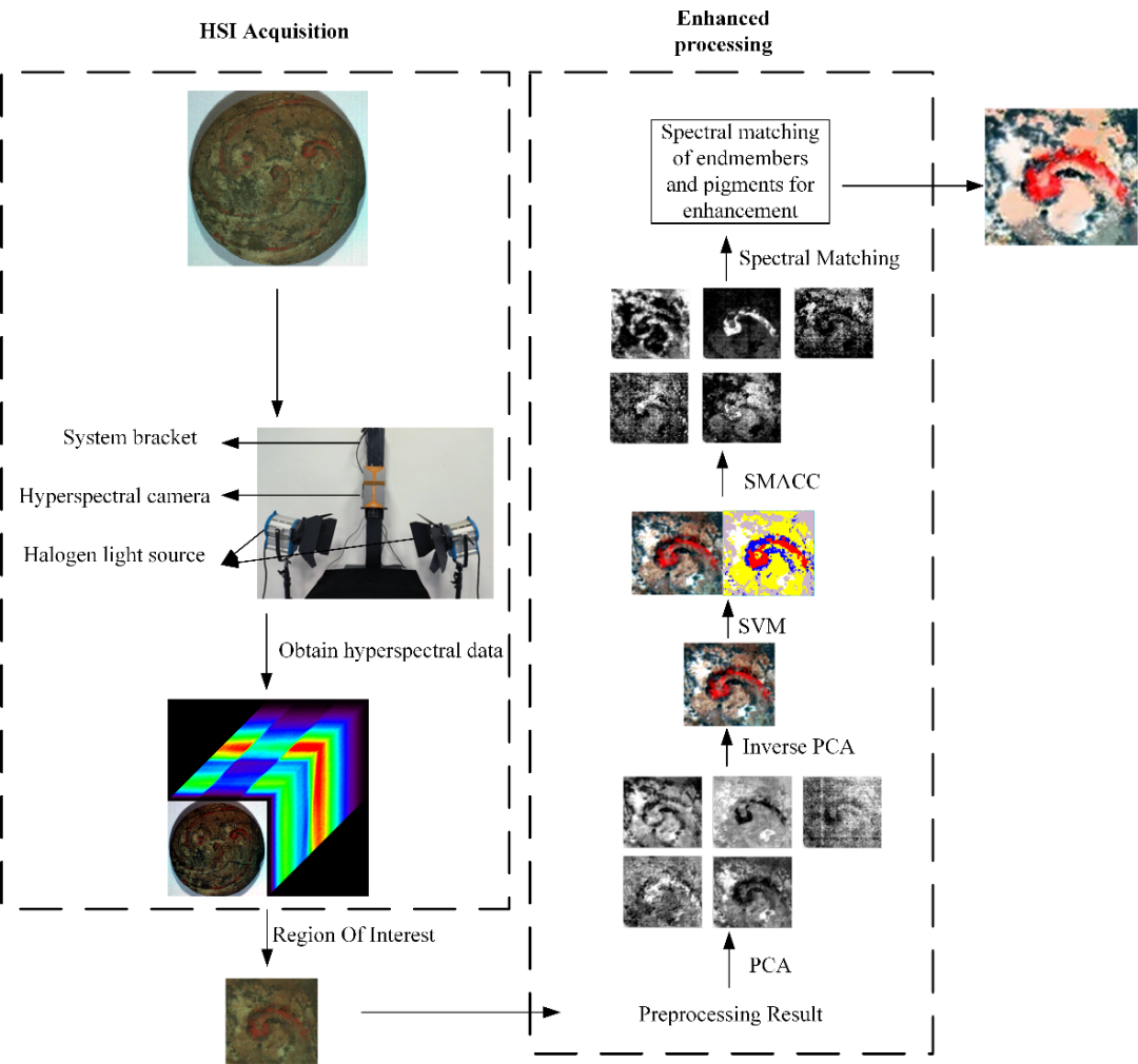針對(duì)彩繪陶器紋樣難以識(shí)別的問題,湯斌團(tuán)隊(duì)提出了結(jié)合主成分分析(PCA)與最大角度凸錐算法(SMACC) 的多級(jí)特征提取圖像增強(qiáng)方法。本研究方法的總體流程如圖2所示,包括高光譜數(shù)據(jù)采集與增強(qiáng)處理兩部分。通過萊森光學(xué)iSpecHyper-VS1000系統(tǒng)獲取文物表面可見–近紅外光譜信息,經(jīng)PCA降維、SVM分類與SMACC端元提取后,結(jié)合光譜匹配與HSV融合實(shí)現(xiàn)彩繪紋樣的細(xì)節(jié)增強(qiáng),為文物彩繪的數(shù)字化分析提供了技術(shù)支撐。
