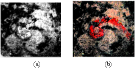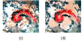 圖3: 多級(jí)特征提取方法在陶器蓋云紋彩繪上的增強(qiáng)效果。(a) 紅色特征掩膜圖像;(b) 紅色特征增強(qiáng)后的偽彩色圖像;(c) PCA重建的真彩偽色圖像;(d) 最終融合增強(qiáng)后的圖像。