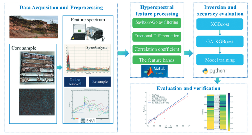 算法路線:將 分?jǐn)?shù)階微分(FOD)用于光譜特征增強(qiáng),并以相關(guān)系數(shù)法篩選關(guān)鍵波段;再由遺傳算法(GA)優(yōu)化 XGBoost超參數(shù),構(gòu)建 Li?O 含量定量反演體系,實(shí)現(xiàn)算法創(chuàng)新 × 光譜測(cè)量的高效耦合。